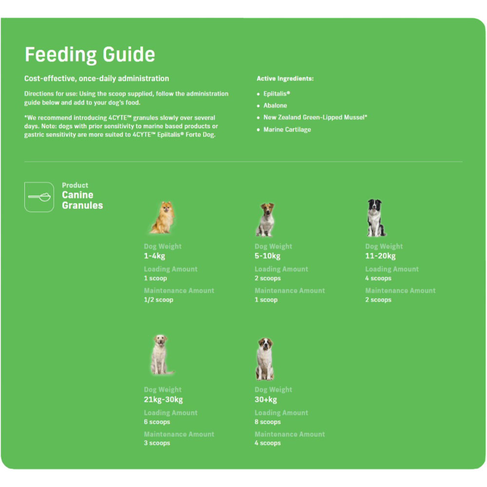 • In high-risk large and giant breeds, 4CYTE™ for Dogs may also be used as a protective and preventative measure against joint damage