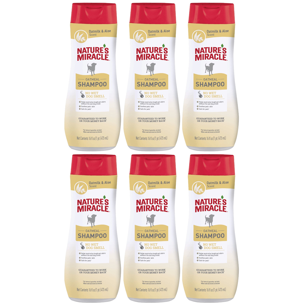 When strong dog odors start to crinkle your nose, it’s time for Nature’s Miracle™ Oatmeal Shampoo! The reformulated shampoo helps neutralize odors and freshens with a light oatmilk and aloe scent, without the wet dog smell. Containing oatmeal, aloe, and vitamin B5, this shampoo provides moisture and shine and soothes skin for the ultimate grooming experience.