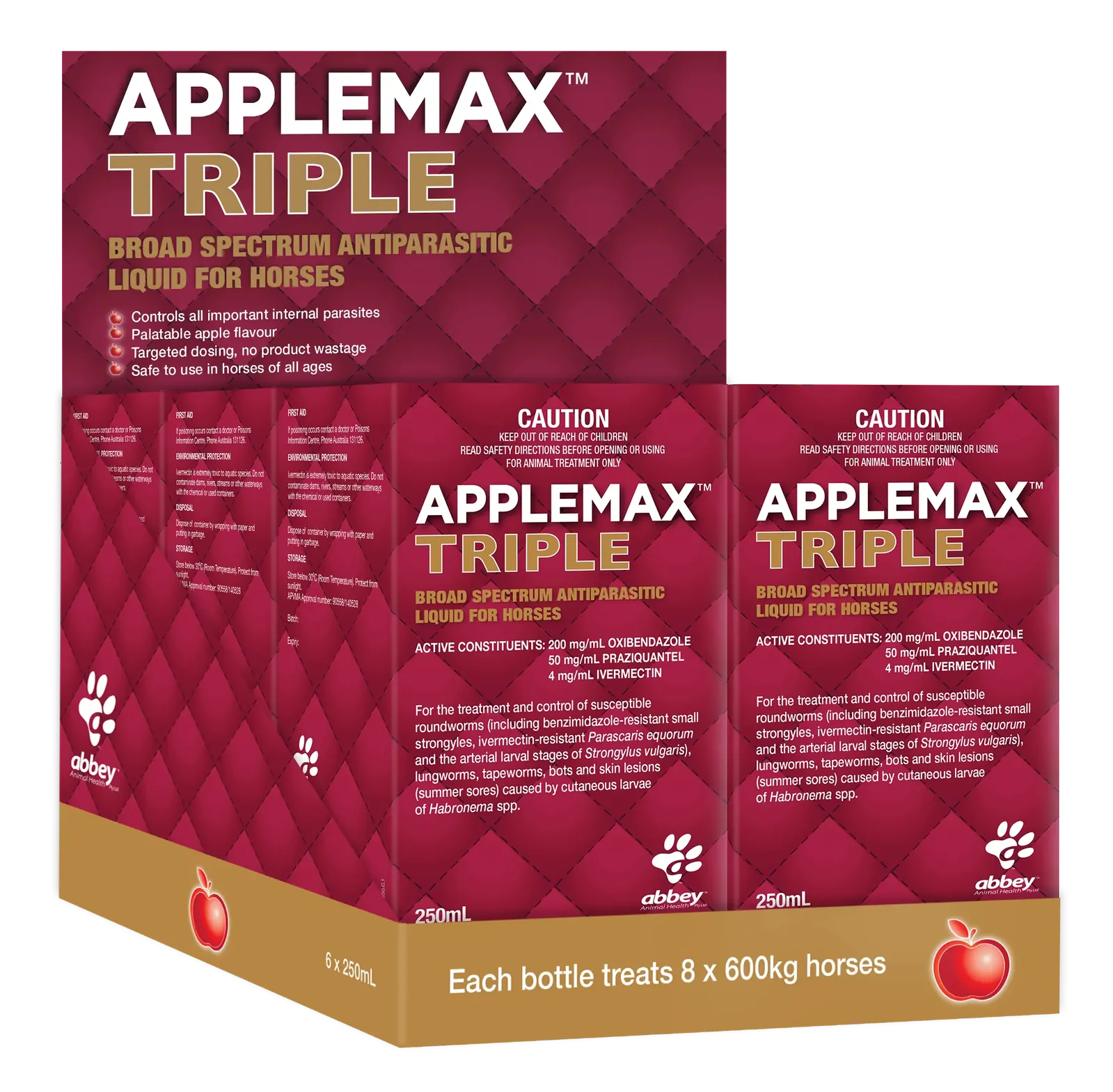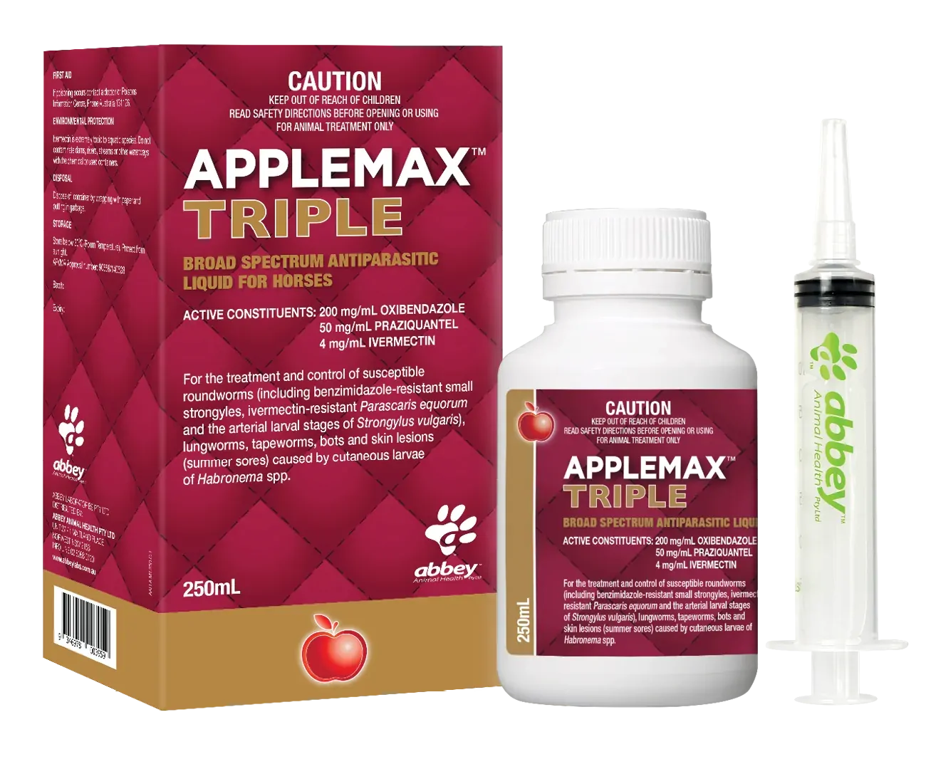 APPLEMAX™ TRIPLE should be given orally at the recommended dose level of 1mL/20kg bodyweight. The dose of 1mL/20kg bodyweight delivers 0.2mg/kg of ivermectin, 10mg/kg oxibendazole and 2.5mg/kg of praziquantel. APPLEMAX™ TRIPLE is a ready to use combination drench and can be given using standard drenching equipment. Deposit the medication on the rear of the tongue. Immediately raise the horse's head for a few seconds after dosing to ensure the full dose has been swallowed. Drench guns should be rinsed with water immediately after use. Do not underdose. Dose rate should be based on the label directions for each weight range. Correct drenching technique should be used. Check the accuracy of drench guns regularly.