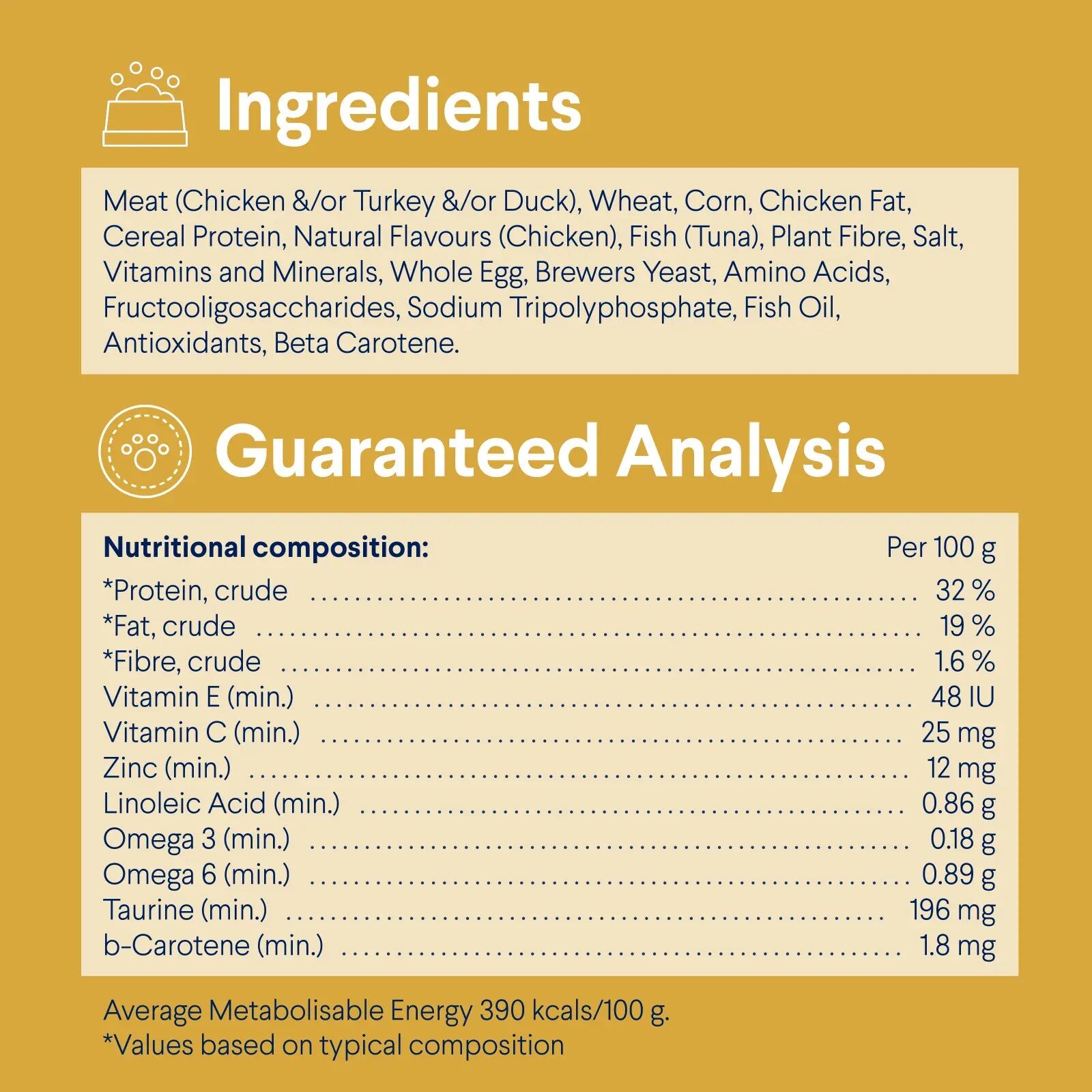 Meat (Chicken &/Or Turkey &/Or Duck), Wheat, Corn, Chicken Fat, Cereal Protein, Natural Flavours (Chicken), Fish (Tuna), Plant Fibre, Salt, Vitamins And Minerals, Whole Egg, Brewers Yeast, Amino Acids, Fructooligosaccharides, Sodium Tripolyphosphate, Fish Oil, Antioxidants, Beta Carotene.