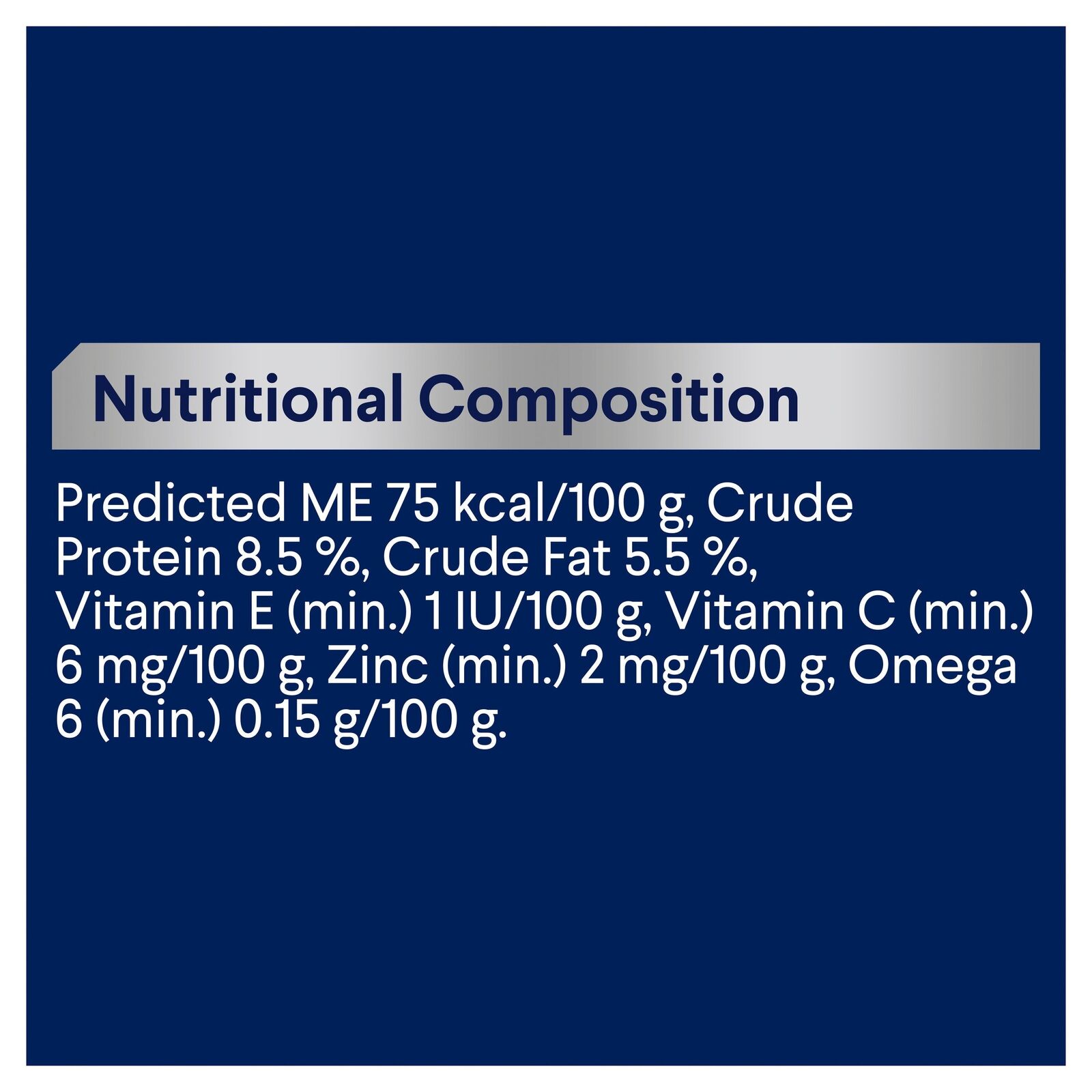 - Predicted Metabolisable Energy 75kcal/100g.