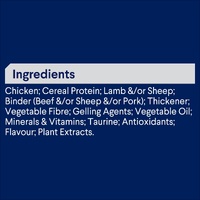 Chicken; Cereal Protein; Lamb &/or Sheep; Binder (Beef &/or Sheep &/or Pork); Thickener; Vegetable Fibre; Gelling Agents; Vegetable Oil; Minerals & Vitamins; Taurine; Antioxidants; Flavour; Plant Extracts.
