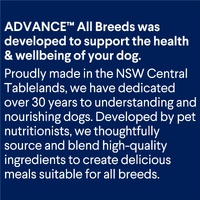 ADVANCE All Breeds Total Wellbeing for All Adult Dogs delivers optimal nutrition for Australian pets by combining global science with local expertise and select natural ingredients. ADVANCE products are uniquely formulated for Australian pets.