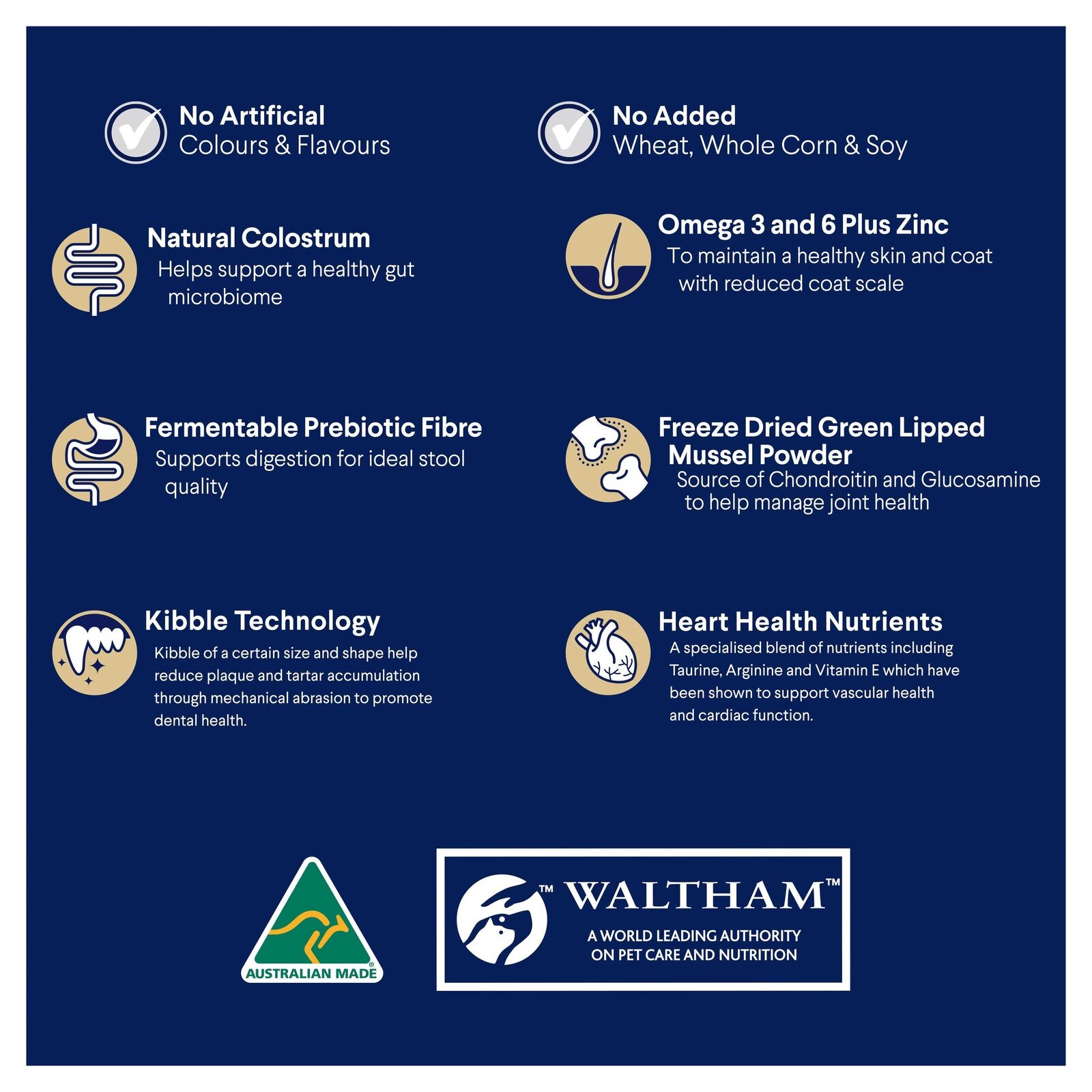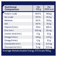 Turkey Meal; Rice; Sorghum; Rice Flour; Chicken Fat; Natural Flavour (Chicken); Sunflower Oil; Dried Beet Pulp; Vitamins and Minerals; Salt; Inulin; Green Lipped Mussel Powder; Antioxidants; Amino Acids (incl. Methionine);