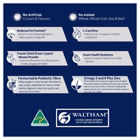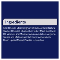 Rice; Chicken Meal; Sorghum; Dried Beet Pulp; Natural Flavour (Chicken); Chicken Fat; Turkey Meal; Sunflower Oil; Vitamins and Minerals; Amino Acids (incl. Arginine, Taurine and Methionine); Salt; Inulin; Antioxidants; Green Lipped Mussel Powder; L-Carnitine.