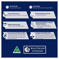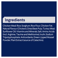 Chicken Meal; Rice; Sorghum; Rice Flour; Chicken Fat; Natural Flavour (Chicken); Dried Beet Pulp, Turkey Meal; Sunflower Oil, Vitamins and Minerals; Salt; Amino Acids (incl. Arginine, Taurine and Methionine), Inulin, Sodium Tripolyphosphate; Antioxidants; Green Lipped Mussel Powder; Plant Extract (source of Catechins).