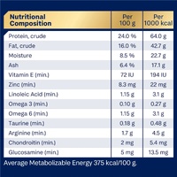 Turkey Meal; Rice; Sorghum; Rice Flour; Chicken Meal; Chicken Fat; Natural Flavour (Chicken); Dried Beet Pulp; Sunflower Oil; Vitamins and Minerals; Fish Oil; Amino Acids (incl. Arginine, Methionine and Taurine); Salt; Inulin; Green Lipped Mussel Powder; Antioxidants.