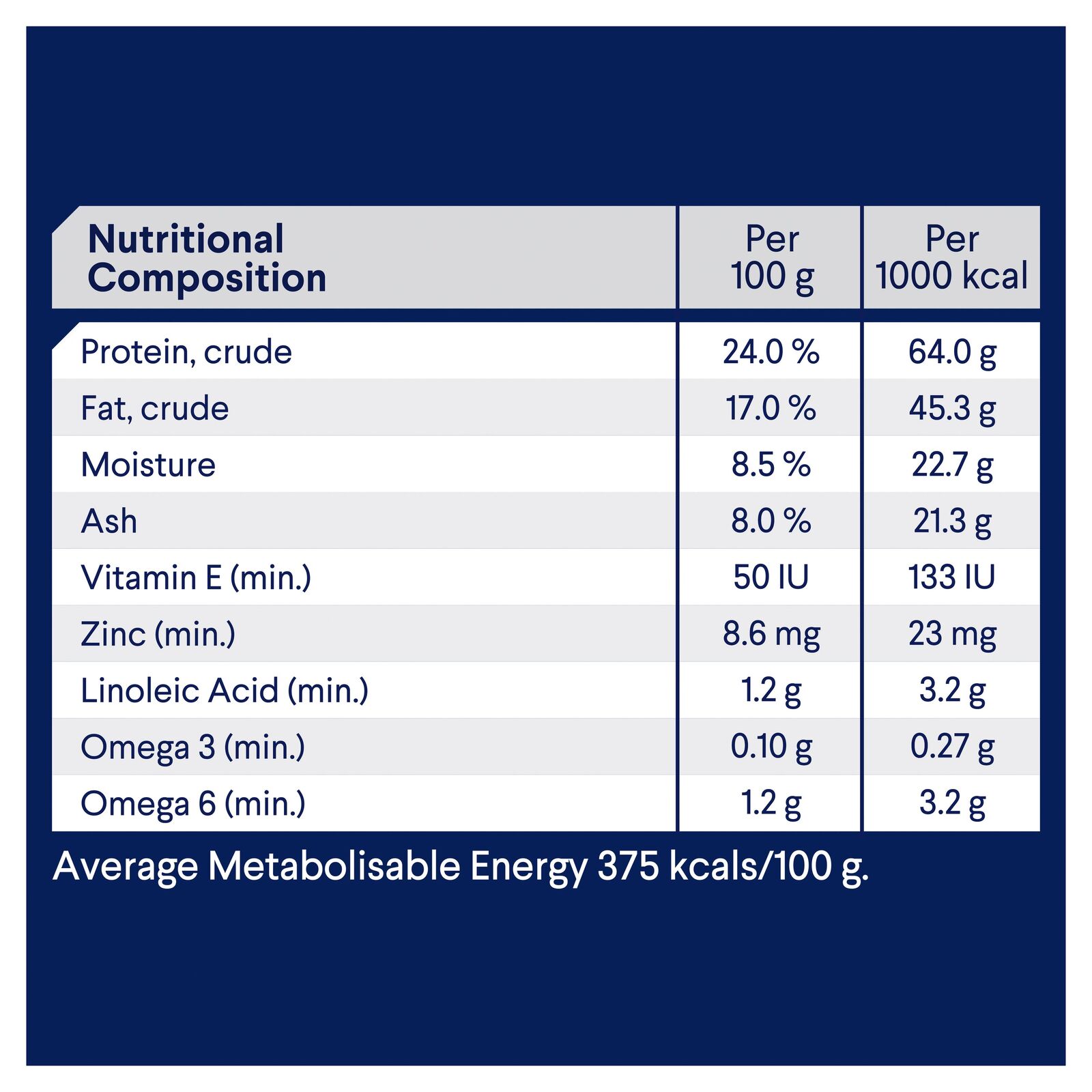 - Average Metabolisable Energy: 375 kcals/100 g.