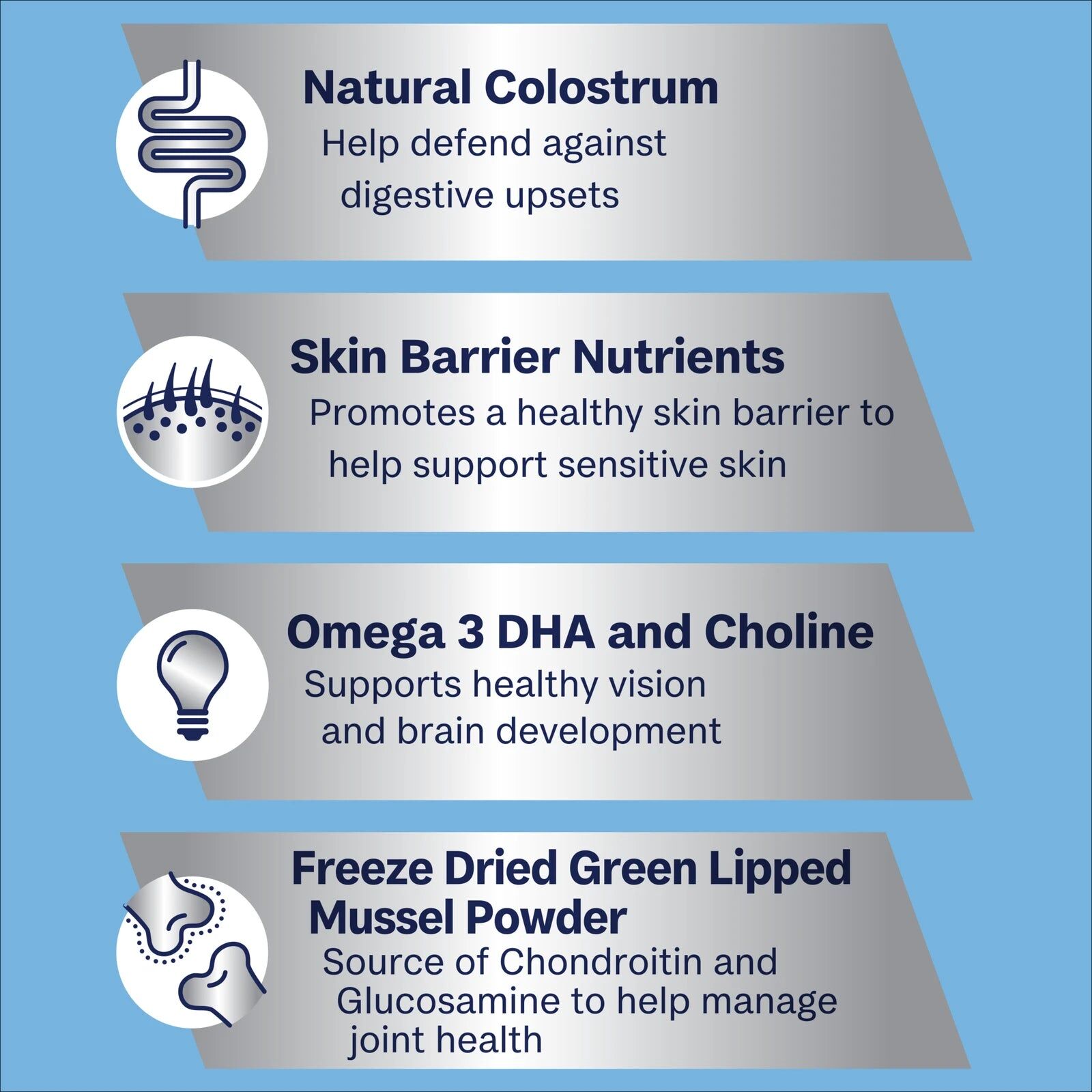 - Natural Colostrum: Colostrum is rich in growth factors, immune factors and immunoglobulins. Given in the diet, these nutrients have been demonstrated to have local effects on the gut lining, providing protection and aiding gut development. Colostrum also helps support a healthy gut microbiome.