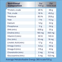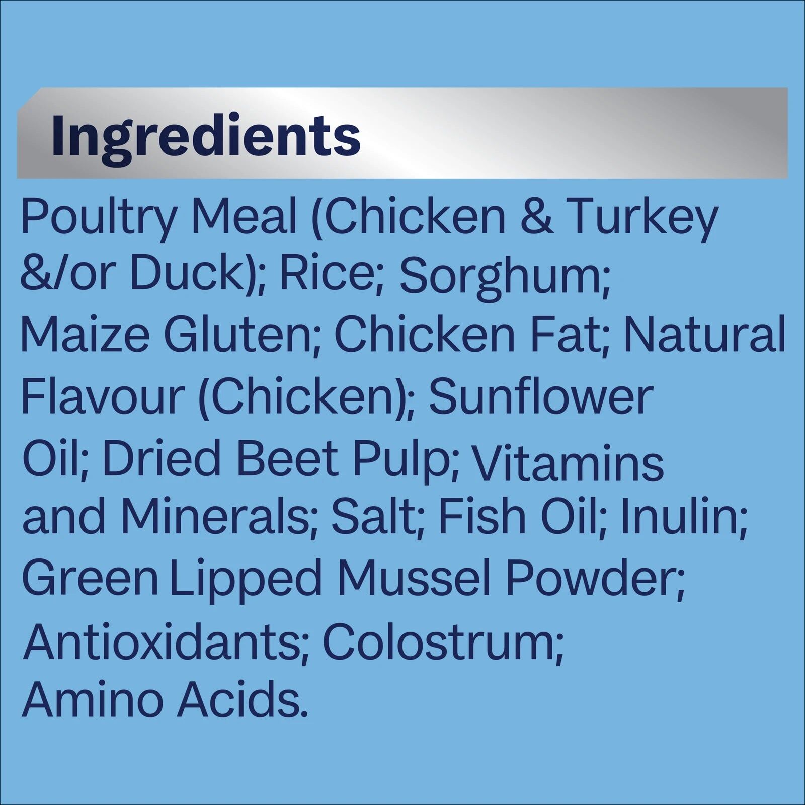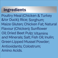 Poultry Meal (Chicken & Turkey &/Or Duck), Rice, Sorghum, Maize Gluten, Chicken Fat, Natural Flavour (Chicken), Sunflower Oil, Dried Beet Pulp, Vitamins And Minerals, Salt, Fish Oil, Inulin, Green Lipped Mussel Powder, Antioxidants, Colostrum, Amino Acids.