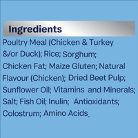 Poultry Meal (Chicken & Turkey &/Or Duck), Rice, Sorghum, Chicken Fat, Maize Gluten, Natural Flavour (Chicken), Dried Beet Pulp, Sunflower Oil, Vitamins And Minerals, Salt, Fish Oil, Inulin, Antioxidants, Colostrum, Amino Acids.