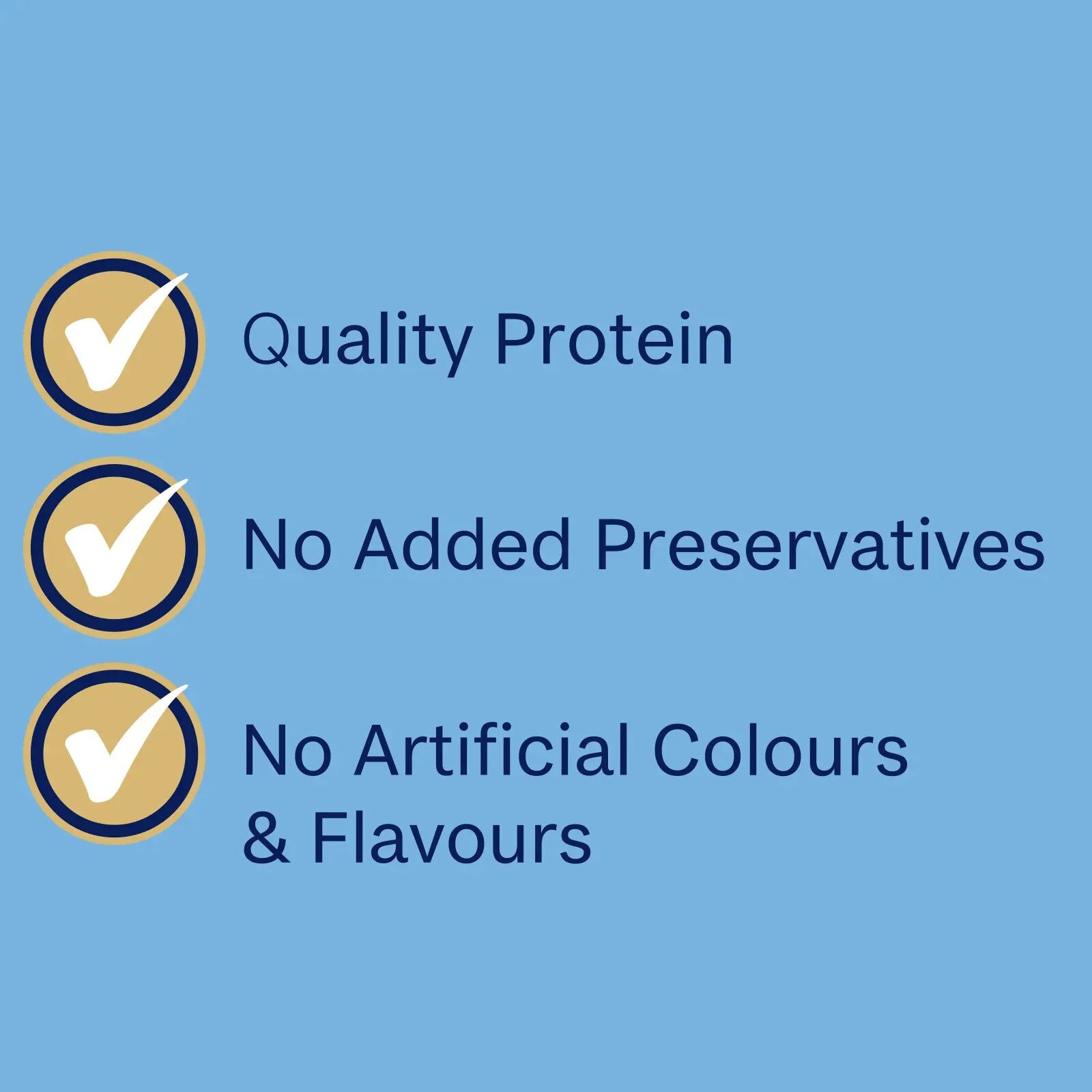 Meat & Animal Ingredients (including Chicken, Turkey (8%), Beef &/or Lamb &/or Pork), Rice (2.5%), Plant Fibre, Thickeners, Vitamins & Minerals, Vegetable Oil, Fish Oil, Taurine, Flavour, Plant Extracts.