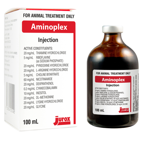Aminoplex is a vitamin and amino acid supplement for use in cattle, horses, dogs and cats as an aid in the treatment of debilitated animals and a supplement for working animals.