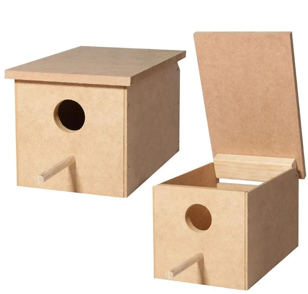Designed with a spacious interior for larger parrot species, the nest box also features a hinged lid for easy monitoring and cleaning without disturbing the birds. It's ideal for use in aviaries or bird enclosures.