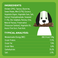 Chicken (29%), Tapioca, Glycerine, Sweet Potato, Mint (3.7%), Coconut, Vegetable Digest, Vegetable Gum, Salt, Sodium Tripolyphosphate, Seaweed (1.1%), Zinc Sulphate, Parsley, Chia, Natural Flavour, Preservative (Potassium Sorbate), Vegetable Oil, Acacia Tree Gum, Food Acid.