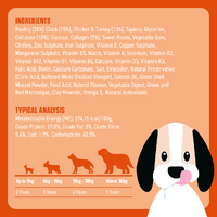 Duck (14%), Poultry (Chicken & Turkey, 13%), Tapioca, Vegetable Humectant (Glycerine), Cellulose (10%), Coconut, Collagen (5%), Sweet Potato, Vegetable Gum, Choline, Zinc Sulphate, Iron Sulphate, Vitamin E, Copper Sulphate, Manganese Sulphate, Vitamin B5, Niacin, Vitamin A, Selenium, Vitamin B2, Vitamin B12, Vitamin B1, Vitamin B6, Calcium, Vitamin D3, Vitamin K3, Folic Acid, Biotin, Calcium Carbonate, Salt, Emulsifier, Natural Preservative, Salmon Oil, Green Shell Mussel Powder, Food Acid, Natural Flavour, Vegetable Digest, Green and Red Macroalgae, Clay Minerals, Omega 3, Natural Antioxidant.