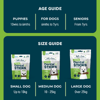 Our range of Dental Sticks have been specifically developed with your dog's age and size in mind. Take a look at our guide below to see what is best for your pet: