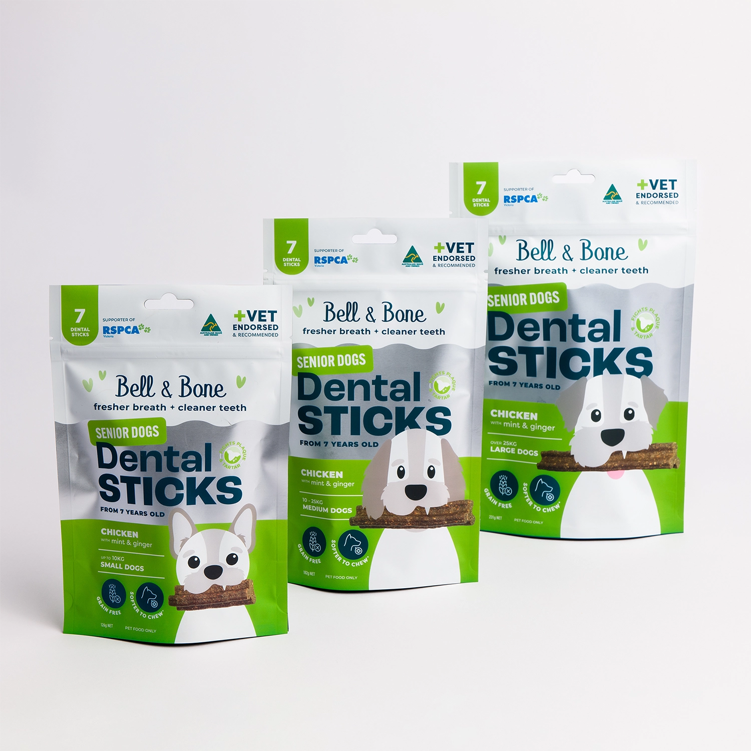 Bell & Bone's Senior Chicken, Mint, and Ginger Dental Sticks have been developed specifically to support your senior dog's oral care and overall well-being as they journey through their mature years. Fighting plaque and tartar build-up with their unique 3-pronged shape, these dental sticks are a softer chew tailored for senior dogs, encouraging gentle chewing and abrasion, and with the support of active ingredients.