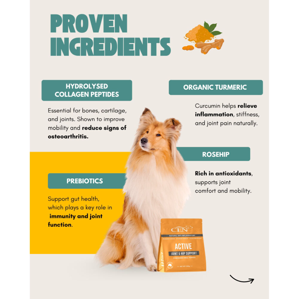 CEN Active is a natural joint & hip supplement to help improve dogs’ mobility and quality of life. Including prebiotics assists in a healthy gut and intestinal microflora, which will boost other body systems, including immunity.