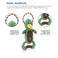 Charming Pet Scrunch Bunch Duck is a plush and squeaky dog toy with various functions and features including dual-end handles that are designed for tugging play and tug-activated squeakers inside. This plush pet toy also includes crinkle paper and is made with durable K9 Tuff Guard technology and materials.