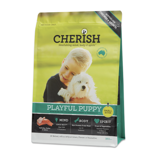 Give your puppy the best start in life. To support brain development and give pup the ability to concentrate for longer and learn faster, Cherish Playful Puppy has a specific and unique blend of plant-based fatty acids and DHA derived from marine algae and deep-sea fish oils. When muscles and bones are rapidly developing, too much protein can do as much harm as too little. Our protein level is carefully balanced with calcium for safe muscle and skeletal growth. Rounding out the goodness is a trio of ancient grains to provide low GI energy to fuel puppy's day.