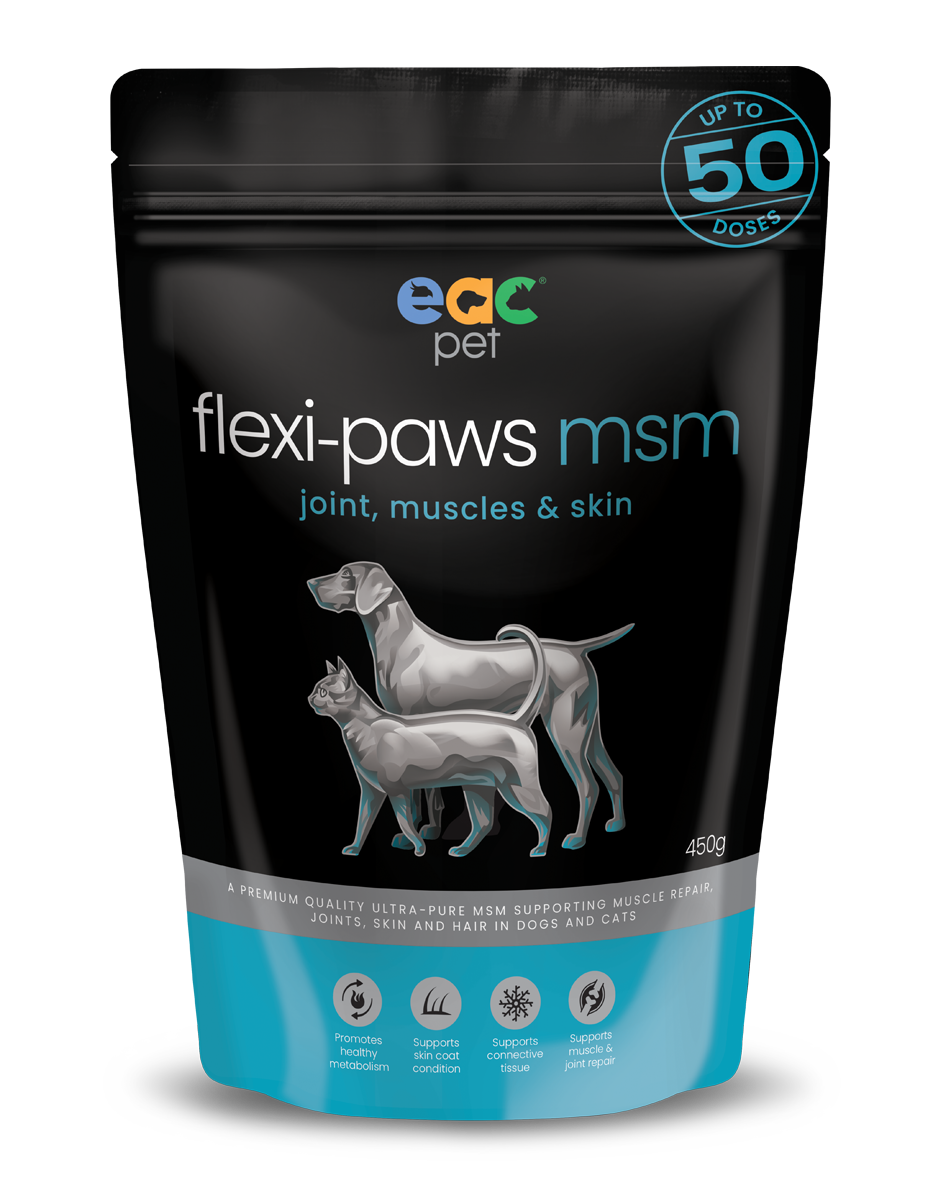 MSM can support your pets when dietary levels of MSM are low and can assist with muscle repair, joint support, skin & coat condition.