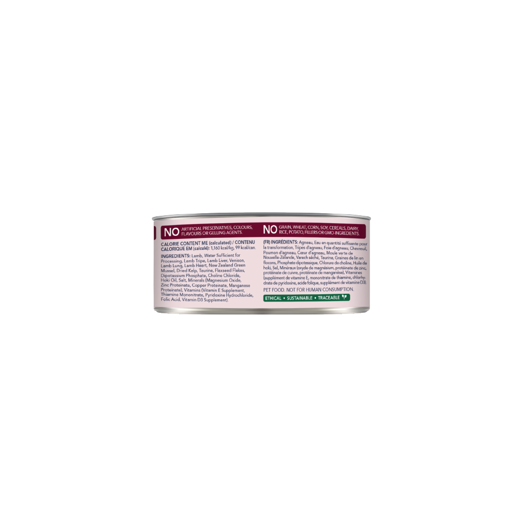 Lamb, Water Sufficient for Processing, Lamb Tripe, Lamb Liver, Venison, Lamb Lung, Lamb Heart, New Zealand Green Mussel, Dried Kelp, Taurine, Flaxseed Flakes, Dipotassium Phosphate, Choline Chloride, Hoki Oil, Salt, Minerals (Magnesium Oxide, Zinc Proteinate, Copper Proteinate, Manganese Proteinate), Vitamins (Vitamin E Supplement, Thiamine Mononitrate, Pyridoxine Hydrochloride, Folic Acid, Vitamin D3 Supplement).