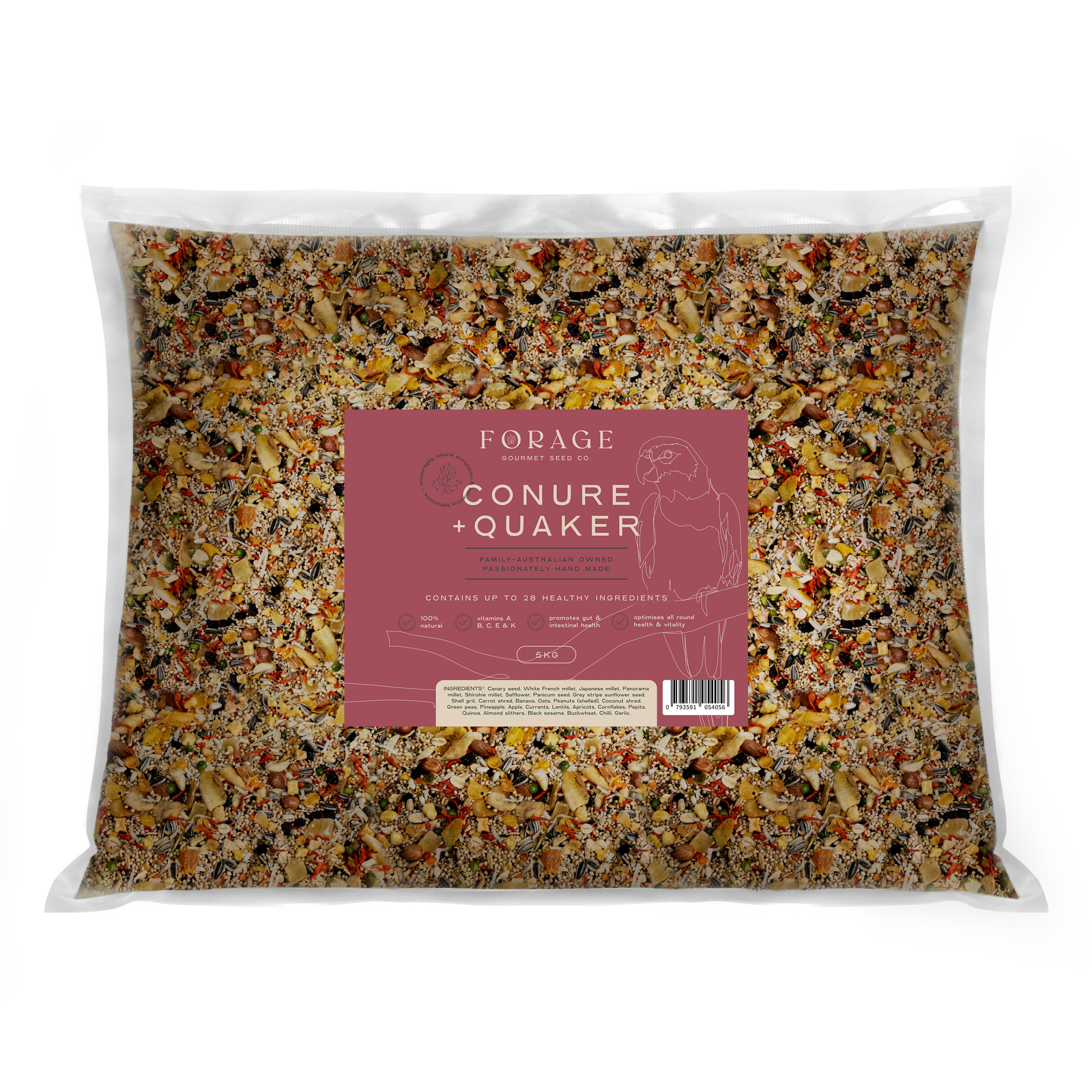 Canary seed, White French millet, Japanese millet, Panorama millet, Shirohie millet, Safflower, Panicum seed, Grey stripe sunflower seed, Carrot shred, Banana, Oats, Peanuts (shelled), Coconut shred, Green peas, Pineapple, Apple, Currants, Lentils, Apricots, Cornflakes, Pepita, Quinoa, Almond slithers, Black sesame, Buckwheat, Chilli.
