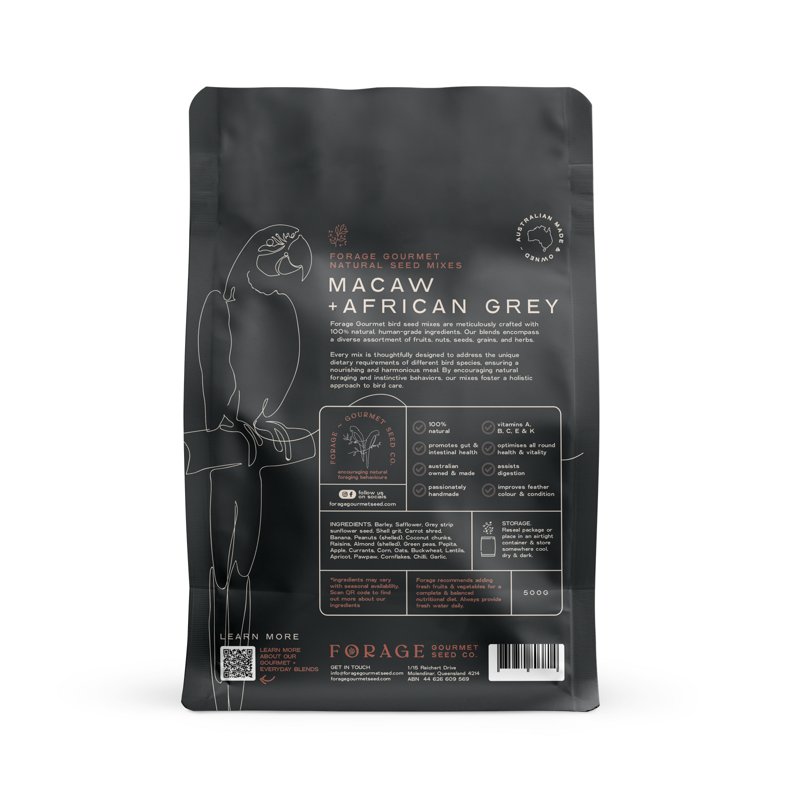 Fuel your intelligent, vibrant companions with our Gourmet Amazon, Macaw & African Grey Mix, a gourmet bird seed mix specially designed for Macaws, Amazons, African Greys, and other large parrots. Packed with a wholesome variety of seeds, nuts, fruits, and veggies, this blend supports both physical health and mental stimulation.
