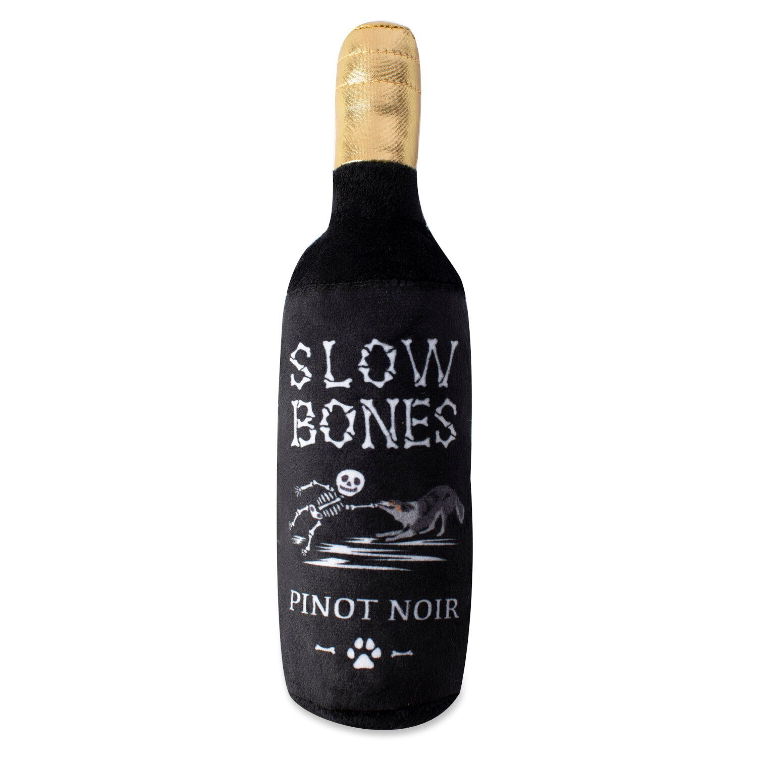 Say bone-jour to never-ending fun with the Fringe Studios PetShop Halloween Slow Bones Pinot Noir Bottle Plush Squeaky Dog toy!