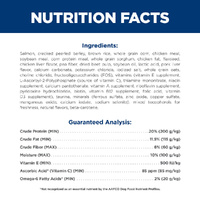 Salmon, Cracked Pearled Barley, Brown Rice, Whole Grain Corn, Chicken Meal, Soybean Meal, Corn Protein Meal, Whole Grain Sorghum, Chicken Fat, Flaxseed, Chicken Liver Flavor, Pea Fiber, Dried Beet Pulp, Soybean Oil, Lactic Acid, Pork Liver Flavor, Calcium Carbonate, Potassium Chloride, Iodized Salt, Whole Grain Oats, Choline Chloride, Fructooligosaccharides (FOS), vitamins (Vitamin E Supplement, LAscorbyl-2-Polyphosphate (source of Vitamin C), Thiamine Mononitrate, Niacin Supplement, Calcium Pantothenate, Vitamin A Supplement, Riboflavin Supplement, Pyridoxine Hydrochloride, Biotin, Vitamin B12 Supplement, Folic Acid, Vitamin D3 Supplement), Taurine, minerals (Ferrous Sulfate, Zinc Oxide, Copper Sulfate, Manganous Oxide, Calcium Iodate, Sodium Selenite), Mixed Tocopherols for freshness, Natural Flavors, Beta-Carotene.