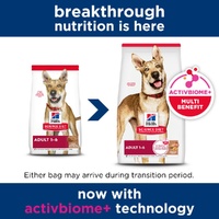 When dogs are in the prime of their life, they'll need a premium pet food that can keep up. Hill's Science Diet Adult dry dog food uses a high quality protein source for lean muscles, natural fibres for healthy digestion and omega-6s for a beautiful coat. Specially formulated to make grown dogs come running for mealtime, this adult food provides the right balance of nutrients to help dogs live a happy, healthy life. Now there is even more to love with a special blend of prebiotic fibres and antioxidants, ActivBiome+ Multi-Benefit, to support digestion, immune system and organ health.