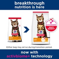 Whether your cat has a noticeable weight issue, or you would just like to keep your cat friend at a healthy weight. Hill's Science Diet Light Adult dry cat food is precise nutrition for less active Adult cats requiring a low-calorie food. This cat food made with natural ingredients provides 20% fewer calories vs. Hill's Science Diet Adult, along with L-Carnitine to help support an ideal body weight in your grown cat. The quality protein and natural fibres help support your Adult cat's hunger between meals, while vitamin E and omega-6 fatty acids promote shiny fur and nourish the skin. Plus there is even more to love with a special blend of prebiotic fibres and antioxidants, ActivBiome+ Multi-Benefit, to support digestion, immune system and organ health.
