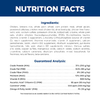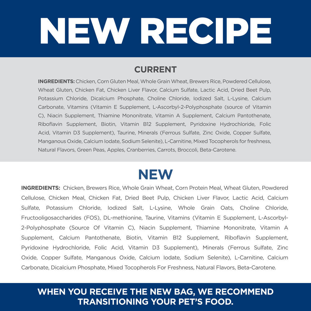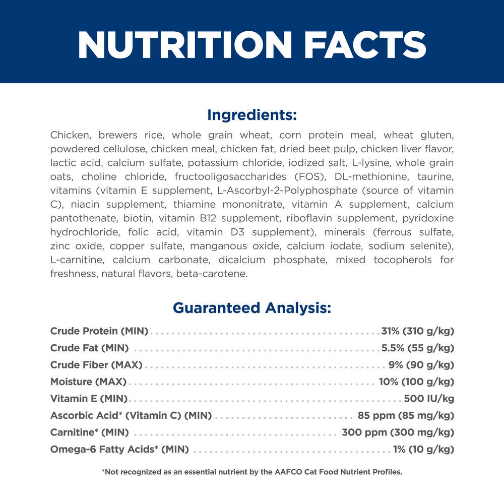 Chicken, Brewers Rice, Whole Grain Wheat, Corn Protein Meal, Wheat Gluten, Powdered Cellulose, Chicken Meal, Chicken Fat, Dried Beet Pulp, Chicken Liver Flavor, Lactic Acid, Calcium Sulfate, Potassium Chloride, Iodized Salt, L-Lysine, Whole Grain Oats, Choline Chloride, Fructooligosaccharides (FOS), DL-Methionine, Taurine, vitamins (Vitamin E Supplement, L-Ascorbyl-2-Polyphosphate (source of Vitamin C), Niacin Supplement, Thiamine Mononitrate, Vitamin A Supplement, Calcium Pantothenate, Biotin, Vitamin B12 Supplement, Riboflavin Supplement, Pyridoxine Hydrochloride, Folic Acid, Vitamin D3 Supplement), minerals (Ferrous Sulfate, Zinc Oxide, Copper Sulfate, Manganous Oxide, Calcium Iodate, Sodium Selenite), LCarnitine, Calcium Carbonate, Dicalcium Phosphate, Mixed Tocopherols for freshness, Natural Flavors, Beta-Carotene.
