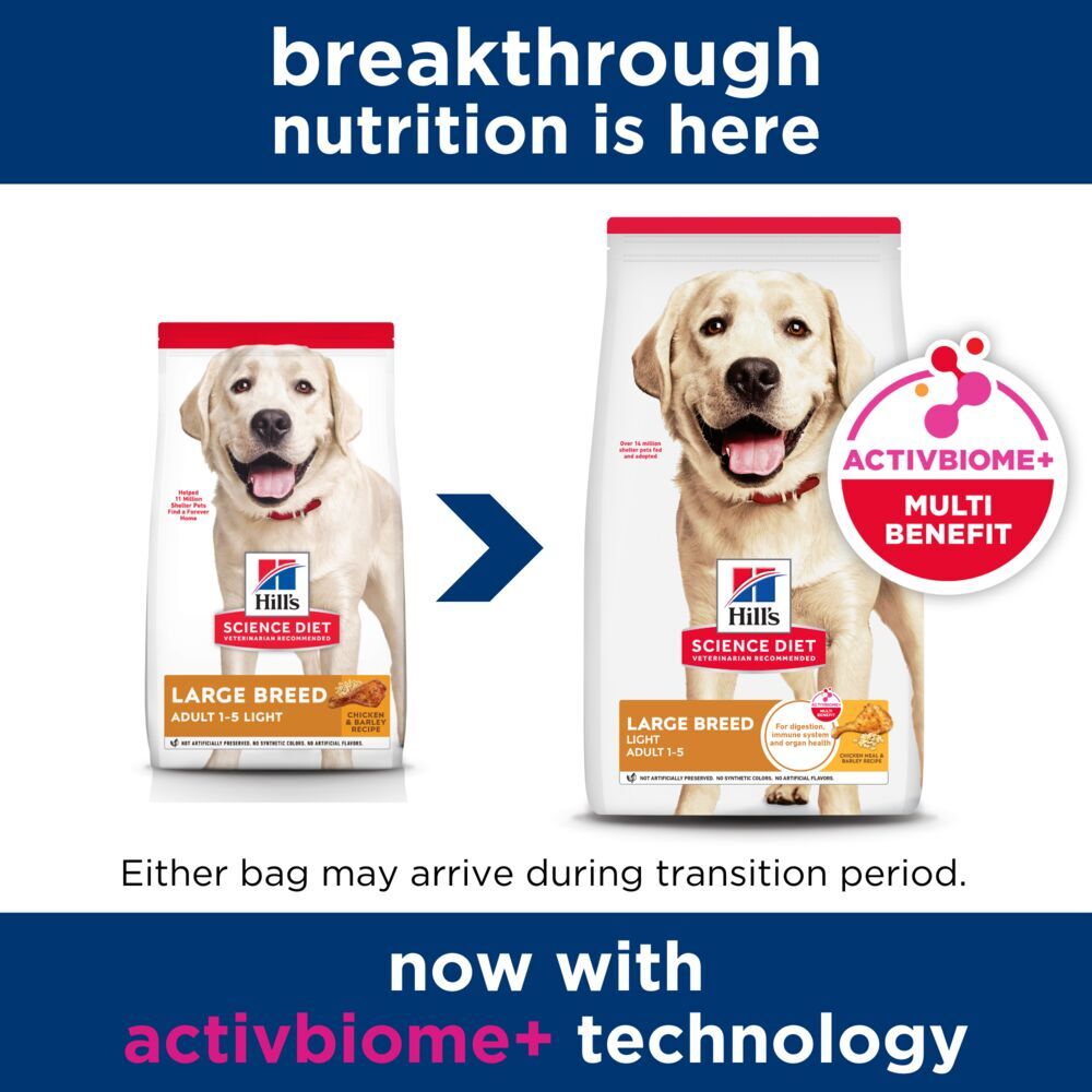 Hill's Science Diet Large Breed Light Adult dry dog food is precise nutrition for less active adult large breed dogs that require a low-calorie pet food to maintain a healthy weight & lifestyle.
