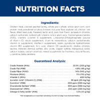 Chicken Meal, Cracked Pearled Barley, Whole Grain Wheat, Whole Grain Corn, Corn Protein Meal, Powdered Cellulose, Brewers Rice, Pea Fiber, Soybean Oil, Chicken Liver Flavor, Dried Beet Pulp, Flaxseed, Lactic Acid, Pork Liver Flavor, Potassium Chloride, Calcium Carbonate, Iodized Salt, L-Lysine, Whole Grain Oats, Fructooligosaccharides (FOS), vitamins (Vitamin E Supplement, L-Ascorbyl-2-Polyphosphate (source of Vitamin C), Niacin Supplement, Thiamine Mononitrate, Calcium Pantothenate, Vitamin A Supplement, Riboflavin Supplement, Biotin, Pyridoxine Hydrochloride, Vitamin B12 Supplement, Folic Acid, Vitamin D3 Supplement), Choline Chloride, Taurine, minerals (Ferrous Sulfate, Zinc Oxide, Copper Sulfate, Manganous Oxide, Calcium Iodate, Sodium Selenite), Mixed Tocopherols for freshness, Natural Flavors, L-Carnitine, Beta-Carotene.