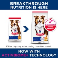 When dogs are in the prime of their life, they'll need a premium pet food that can keep up. Hill's Science Diet Adult 7+ dry dog food is formulated for a grown dog's specific aging needs. A great source of high-quality protein for lean muscle, this dog food made with natural ingredients is easy to digest, and creates a synergistic blend that helps support adult canine energy & activity levels as well as omega-6 fatty acids and vitamin E for a healthy skin and a shiny coat. Now there is even more to love with a special blend of prebiotic fibres and antioxidants, ActivBiome+ Multi-Benefit, to support digestion, immune system and organ health.