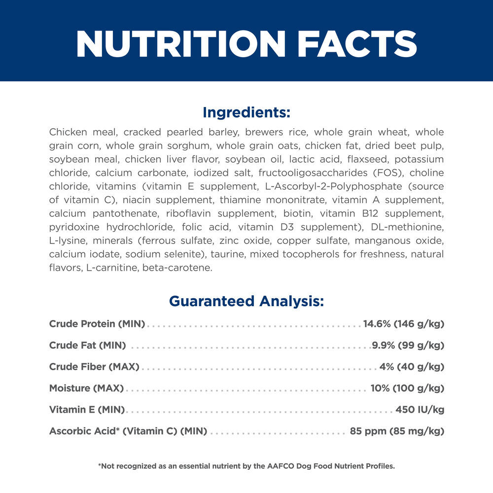Chicken Meal, Cracked Pearled Barley, Brewers Rice, Whole Grain Wheat, Whole Grain Corn, Whole Grain Sorghum, Whole Grain Oats, Chicken Fat, Dried Beet Pulp, Soybean Meal, Chicken Liver Flavor, Soybean Oil, Lactic Acid, Flaxseed, Potassium Chloride, Calcium Carbonate, Iodized Salt, Fructooligosaccharides (FOS), Choline Chloride, vitamins (Vitamin E Supplement, L-Ascorbyl-2-Polyphosphate (source of Vitamin C), Niacin Supplement, Thiamine Mononitrate, Vitamin A Supplement, Calcium Pantothenate, Riboflavin Supplement, Biotin, Vitamin B12 Supplement, Pyridoxine Hydrochloride, Folic Acid, Vitamin D3 Supplement), DL-Methionine, L-Lysine, minerals (Ferrous Sulfate, Zinc Oxide, Copper Sulfate, Manganous Oxide, Calcium Iodate, Sodium Selenite), Taurine, Mixed Tocopherols for freshness, Natural Flavors, L-Carnitine, Beta-Carotene.