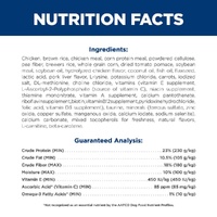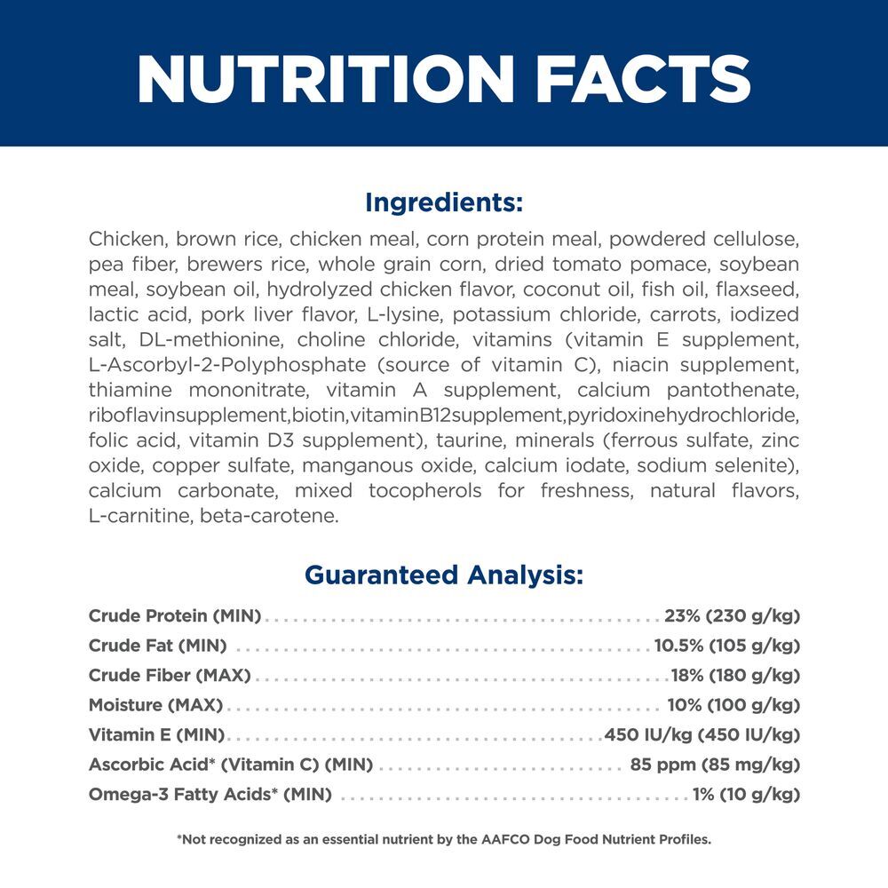 Chicken, Brown Rice, Chicken Meal, Corn Protein Meal, Powdered Cellulose, Pea Fiber, Brewers Rice, Whole Grain Corn, Dried Tomato Pomace, Soybean Meal, Soybean Oil, Hydrolyzed Chicken Flavor, Coconut Oil, Fish Oil, Flaxseed, Lactic Acid, Pork Liver Flavor, L-Lysine, Potassium Chloride, Carrots, Iodized Salt, DL-Methionine, Choline Chloride, vitamins (Vitamin E Supplement, L-Ascorbyl-2-Polyphosphate (source of Vitamin C), Niacin Supplement, Thiamine Mononitrate, Vitamin A Supplement, Calcium Pantothenate, Riboflavin Supplement, Biotin, Vitamin B12 Supplement, Pyridoxine Hydrochloride, Folic Acid, Vitamin D3 Supplement), Taurine, minerals (Ferrous Sulfate, Zinc Oxide, Copper Sulfate, Manganous Oxide, Calcium Iodate, Sodium Selenite), Calcium Carbonate, Mixed Tocopherols for freshness, Natural Flavors, L-Carnitine, Beta-Carotene.