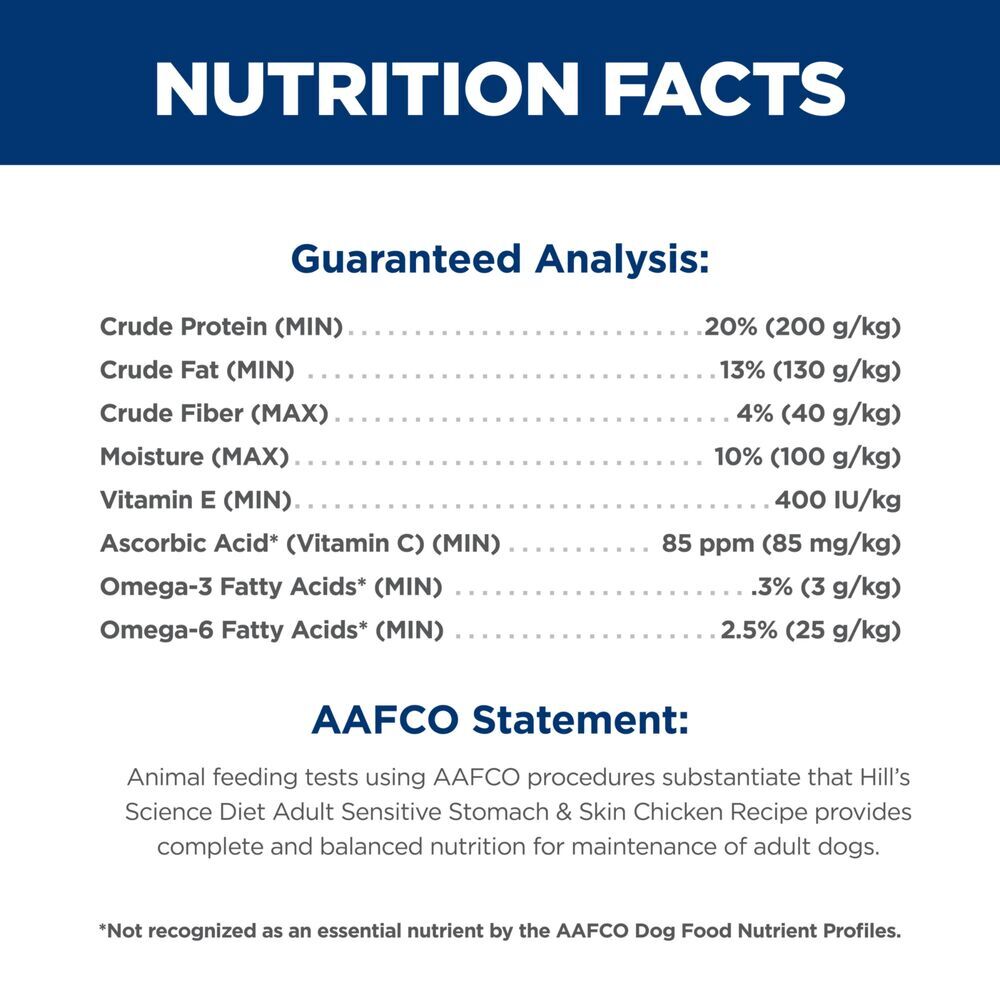- Animal feeding tests using AAFCO procedures substantiate that Hill's Science Diet Adult Sensitive Stomach & Skin Chicken Recipe provides complete and balanced nutrition for maintenance of adult dogs. Fresh water should be available at all times.