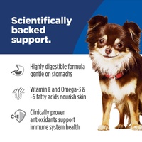 Hill's Science Diet Adult Sensitive Stomach & Skin Small & Mini Chicken Recipe dry dog food is science-backed nutrition that is specially formulated to nourish healthy pets who are prone to occasional digestive upsets and support healthy skin. This highly digestible formula for sensitive stomachs uses prebiotic fibre to fuel gut bacteria and support a balanced microbiome. In addition, this dry dog food is made with natural ingredients with added vitamins, minerals and amino acids. This food is an excellent source of vitamin E and Omega-6 fatty acids to nourish the dog's skin, and help maintain a healthy, shiny coat. This food is packed with a powerful combination of clinically proven antioxidants, including vitamins C and E, to support a healthy immune system. This nutrition is formulated with decades of cutting-edge research to be a great-tasting meal for adult dogs.
