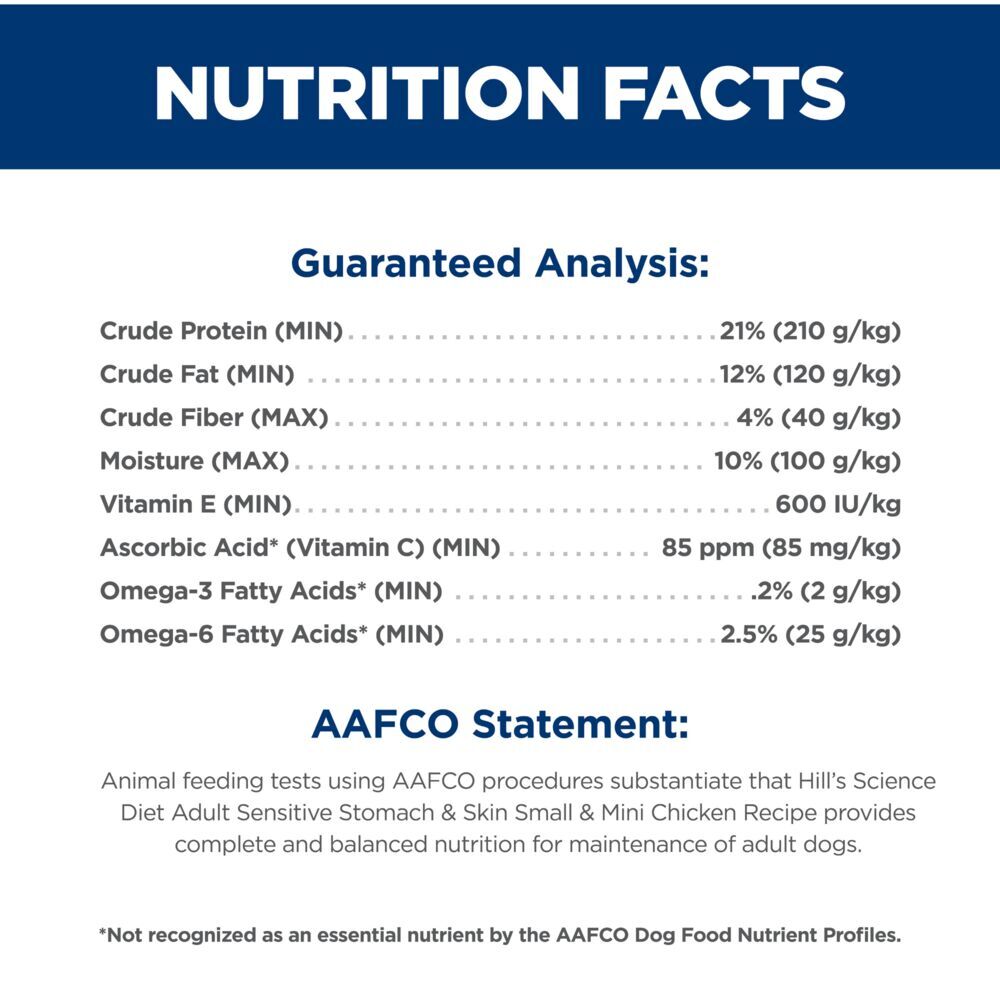 - Animal feeding tests using AAFCO procedures substantiate that Hill's Science Diet Adult Sensitive Stomach & Skin Small & Mini Chicken Recipe Dog Food provides complete and balanced nutrition for maintenance of adult dogs.Fresh water should be available at all times.