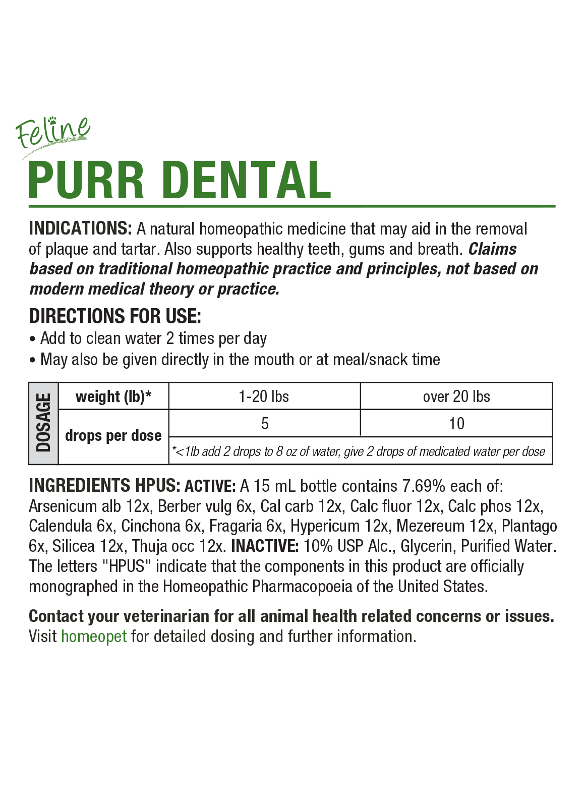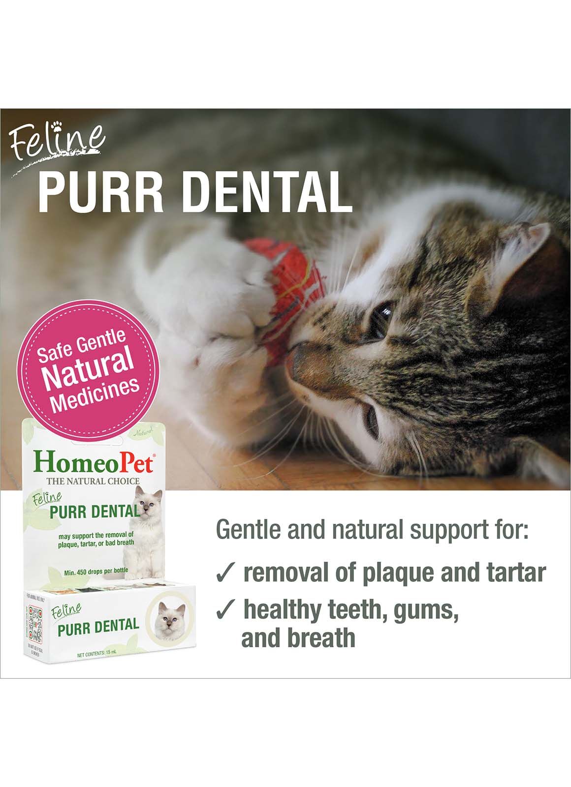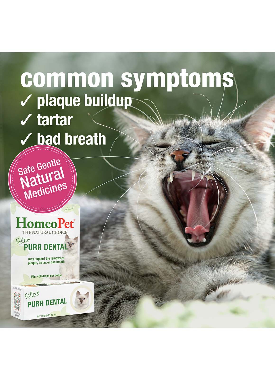 - HomeoPet Feline PURR DENTAL drops have been safely used on cats of all ages for many years.