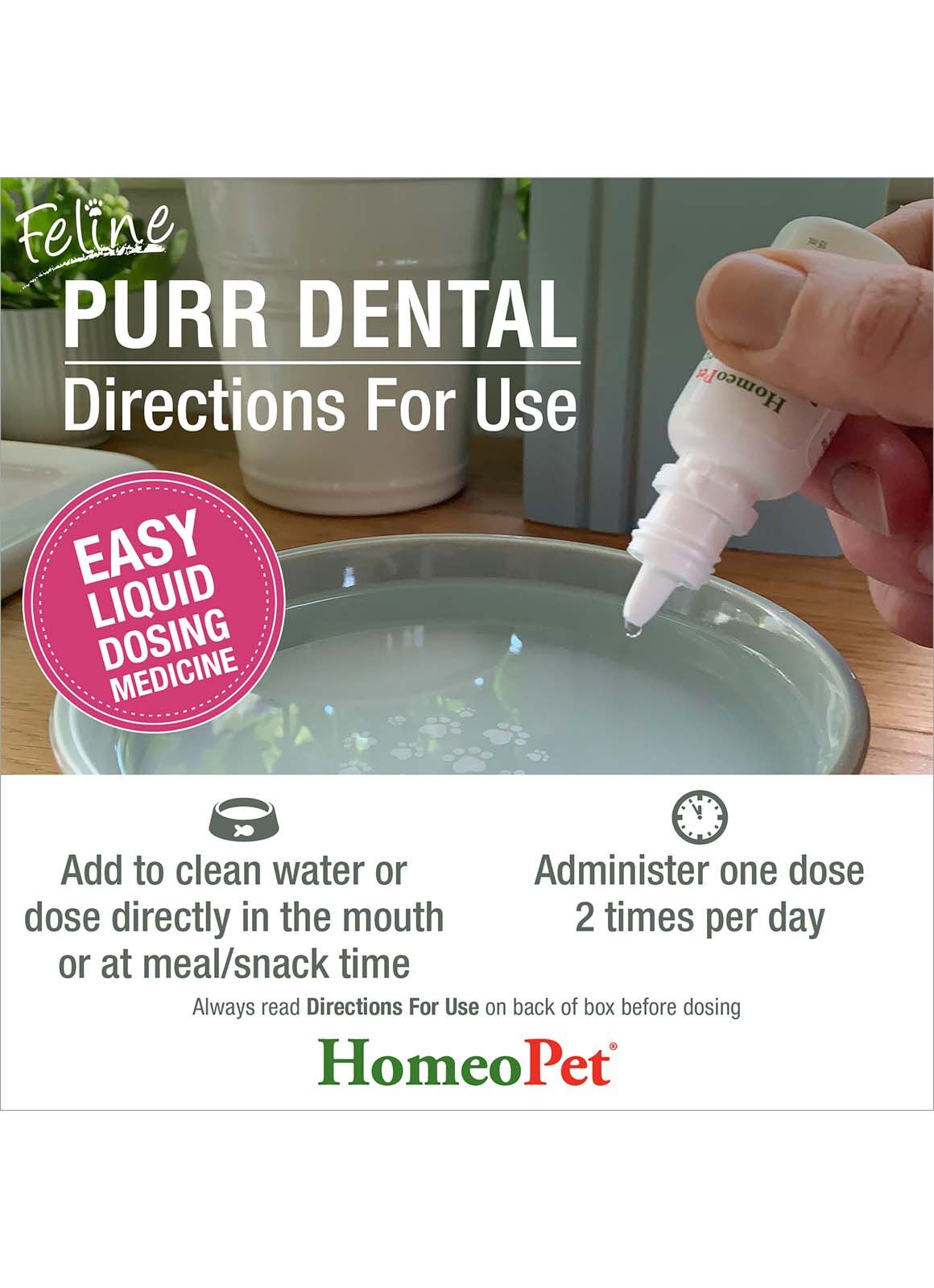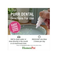 - Easy to dose liquid formulation that is simple and easy to use. You can put the Feline PURR DENTAL drops directly into the mouth, in water or dose at meal or snack time.