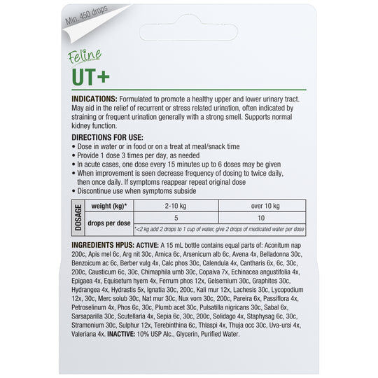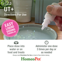HomeoPet Feline UT+ is used to promote a healthy upper and lower urinary tract in cats. May aid in the relief of stress-related urination, often indicated by frequent urination often with a strong smell.