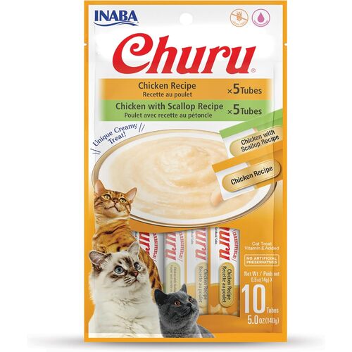 Inaba Churu Chicken and Chicken with Scallop Recipe Creamy Puree is a lickable cat treat made with farm-raised chicken and scallop, a creamy texture and savory flavor your cat can't resist! Product of Thailand. Contains ten 0.5oz tubes.