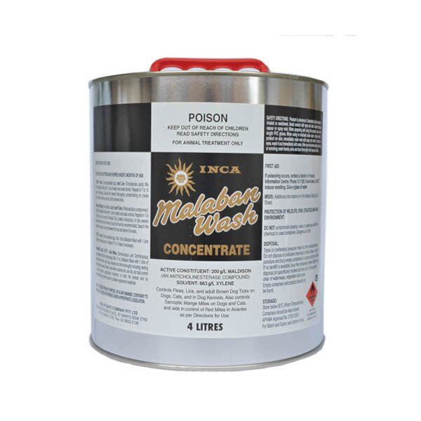 Inca Malaban Wash controls fleas, lice, and adult brown dog ticks on dogs, cats, and in dog kennels. It also controls sarcoptic mange mites on dogs and cats, and helps in the control of red mites in aviaries.