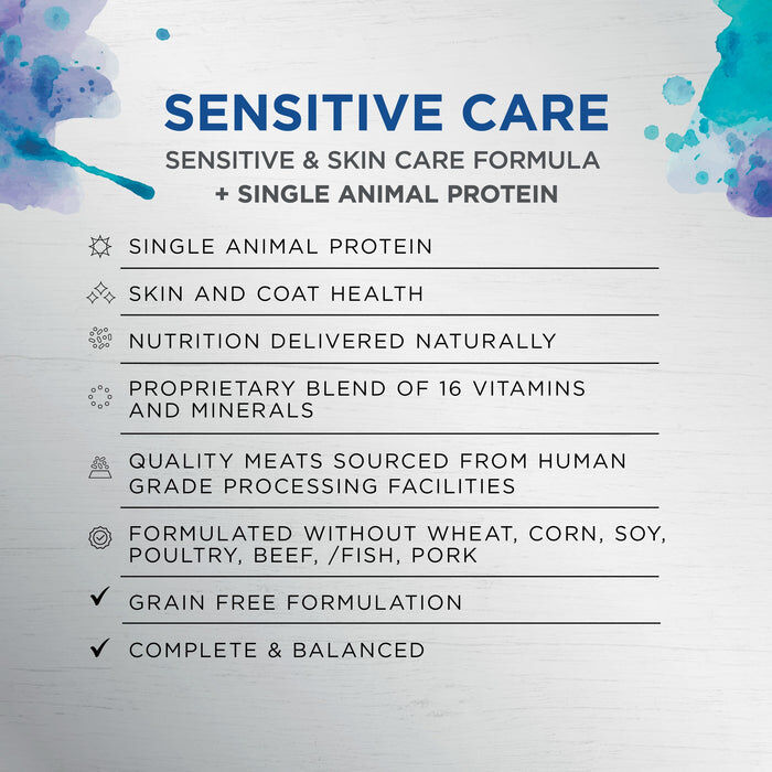 Our team of seasoned research and development pet food specialists, in consultation with veterinary experts, has crafted our Adult Sensitive & Skin Care Formula. It features scientifically validated natural components and utilizes single animal protein for dogs with sensitivities to common proteins, along with omega-3 and omega-6 fatty acids to support their skin health and condition.