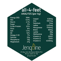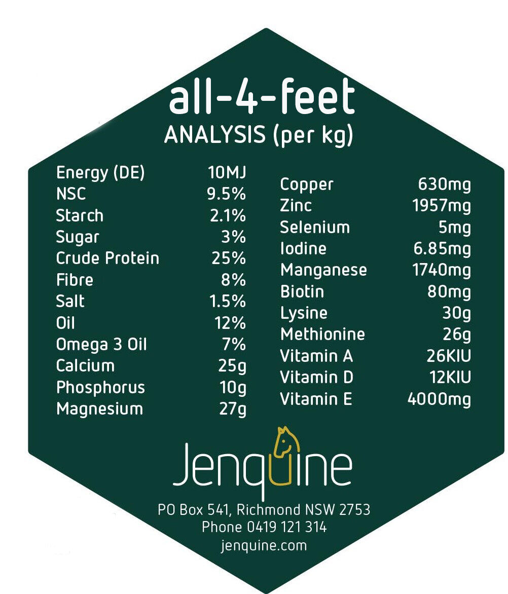 all-4-feet® includes: free-form amino acids, added lysine & methionine, minerals (organic & inorganic), calcium, copper, iodine, magnesium, manganese, phosphorus, potassium, selenium, probiotics, vegetable protein meals (including soy, canola, lucerne, linseed), vitamins A, B-group, D, E, biotin & organic yeast.