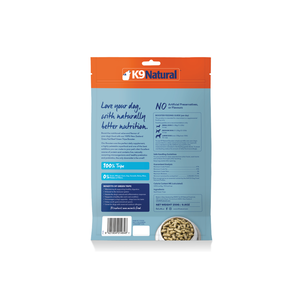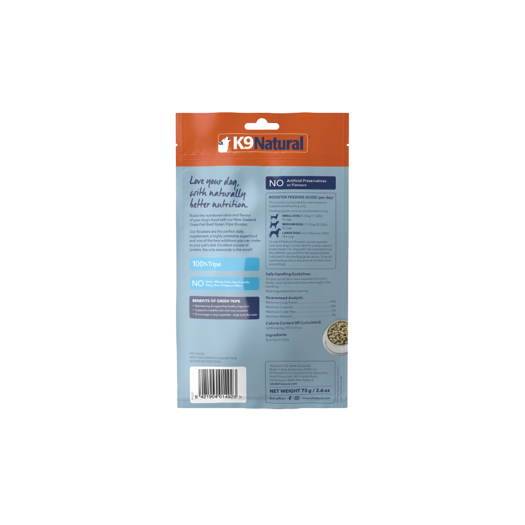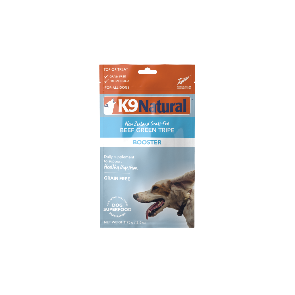 Sourcing only the highest quality New Zealand grass-fed, free-range Beef Green Tripe, K9 Natural Green Tripe Boosters aid in healthy digestion, nourishing skin & coat, assisting immune response and overall health and well-being.